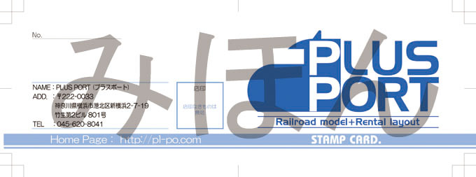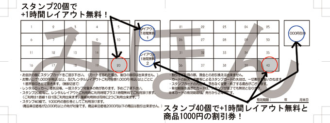 プラスポートではスタンプカードを発行しております。 初回のお会計時に1,000円(税込)以上ご利用時に発行させて頂きます。 (ご希望のお客様はスタンプカードの発行希望をお伝えください。) お会計の際にスタンプカードをご提示下さい。 ※カードを忘れた場合、後日レシートを提示して頂いても捺印は出来ません。※ お買い上げ1,000円(税込)以上、及びレンタルレイアウトご利用金額1,000円(税込)以上ごとに 1箇所捺印させて頂きます。(端数切捨て) レンタルロッカー、委託品等、一部スタンプ対象外の物があります。予めご了承下さい。 スタンプ20個毎に、レンタルレイアウトご利用時に利用時間プラス1時間無料でご利用頂けます。 スタンプ40個で1,000円の割引券としてご利用頂けます。 (商品単品価格が2,000円以上の物が対象です。商品単品価格2000円以下の商品は割引出来ません。) ※スタンプカードの割引券としてのご利用は1回のお買い物に付1枚迄となります。ご了承ください。 |
